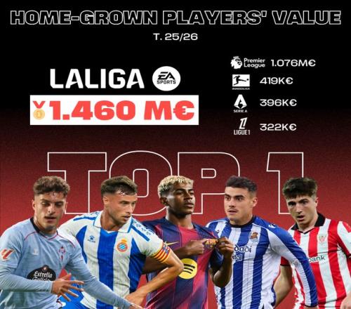 西甲是欧洲青训球员总市场价值最高的联赛,达14.6亿欧元,远超英超(10.7亿欧元)、德甲(9.6亿欧元)、意甲(8.9亿欧元)及法甲(7.6亿欧元)。在2025年夏季转会窗口中,西班牙俱乐部通过本土青训球员转会创下2.89亿欧元的收入纪录,创历史新高,印证了其青训战略的成功。