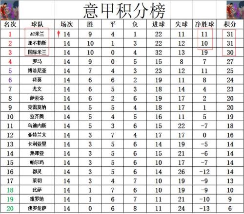积分榜方面,AC米兰逆转绝杀都灵后夺取3连胜,这3场比赛他们都是1球小胜,这样的话他们再超过国米1分,还是凭借1个净胜球优势力压那不勒斯再次登顶。前三分差在1分之间,意甲还是五大联赛榜首争夺最激烈的。